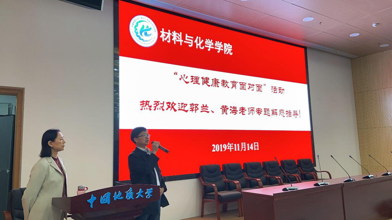 (通讯员:高虞涛)11月14日下午,材料与化学学院“心理健康教育面对面”活动在材化楼110举行。学校马克思主义大学生心理健康教育中心郭兰教授、黄海副教授进行专题讲解交流,学院班主任学务指导老师和部分导师参加讲座交流,材料与化学学院党委副书记余江涛主持活动。