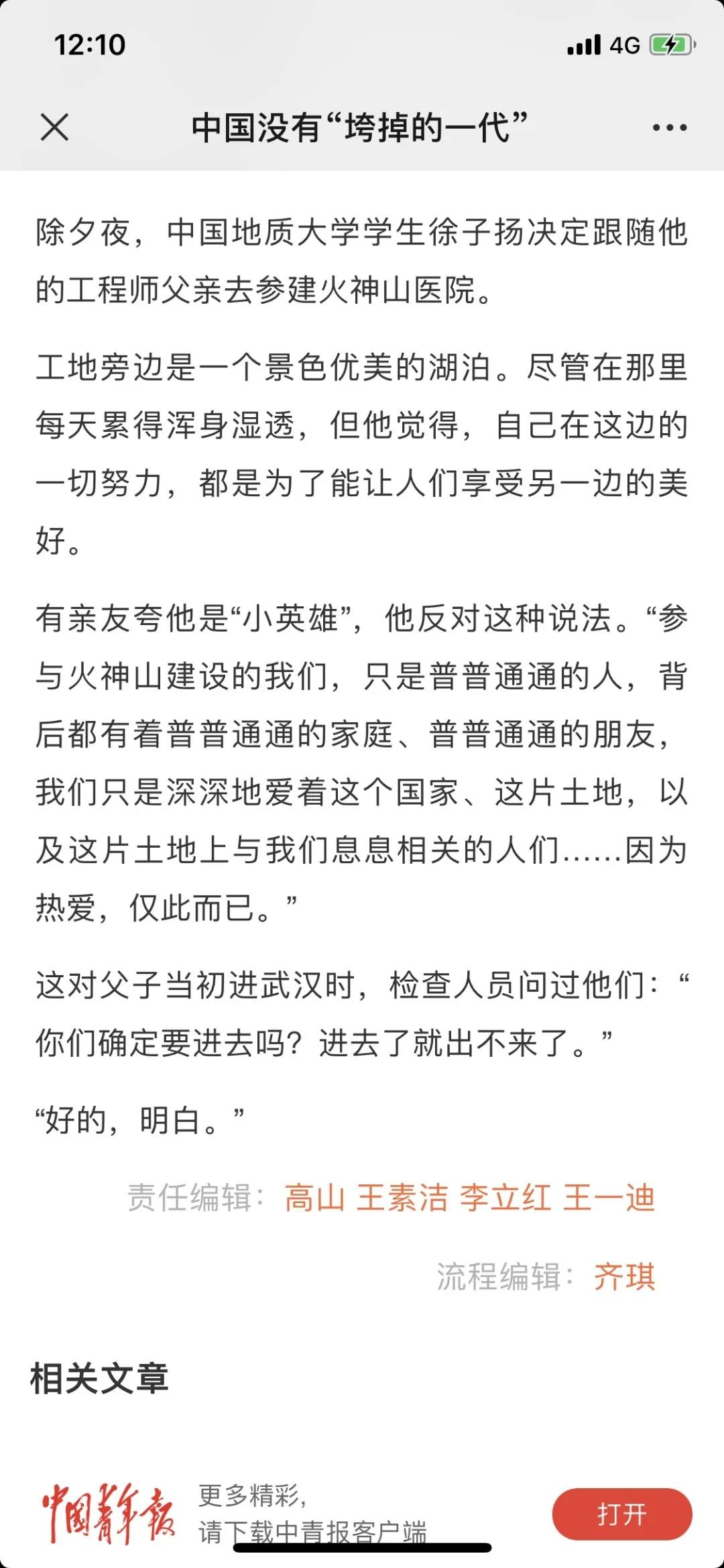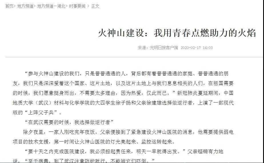 徐子扬同学于2020年1月25日奔赴武汉,连续10天全程参与火神山医院建设。前后共历时29天,他完成了一名普通学生向有为青年的转变,谱写了当代青年与祖国同呼吸、共命运的青春之歌。