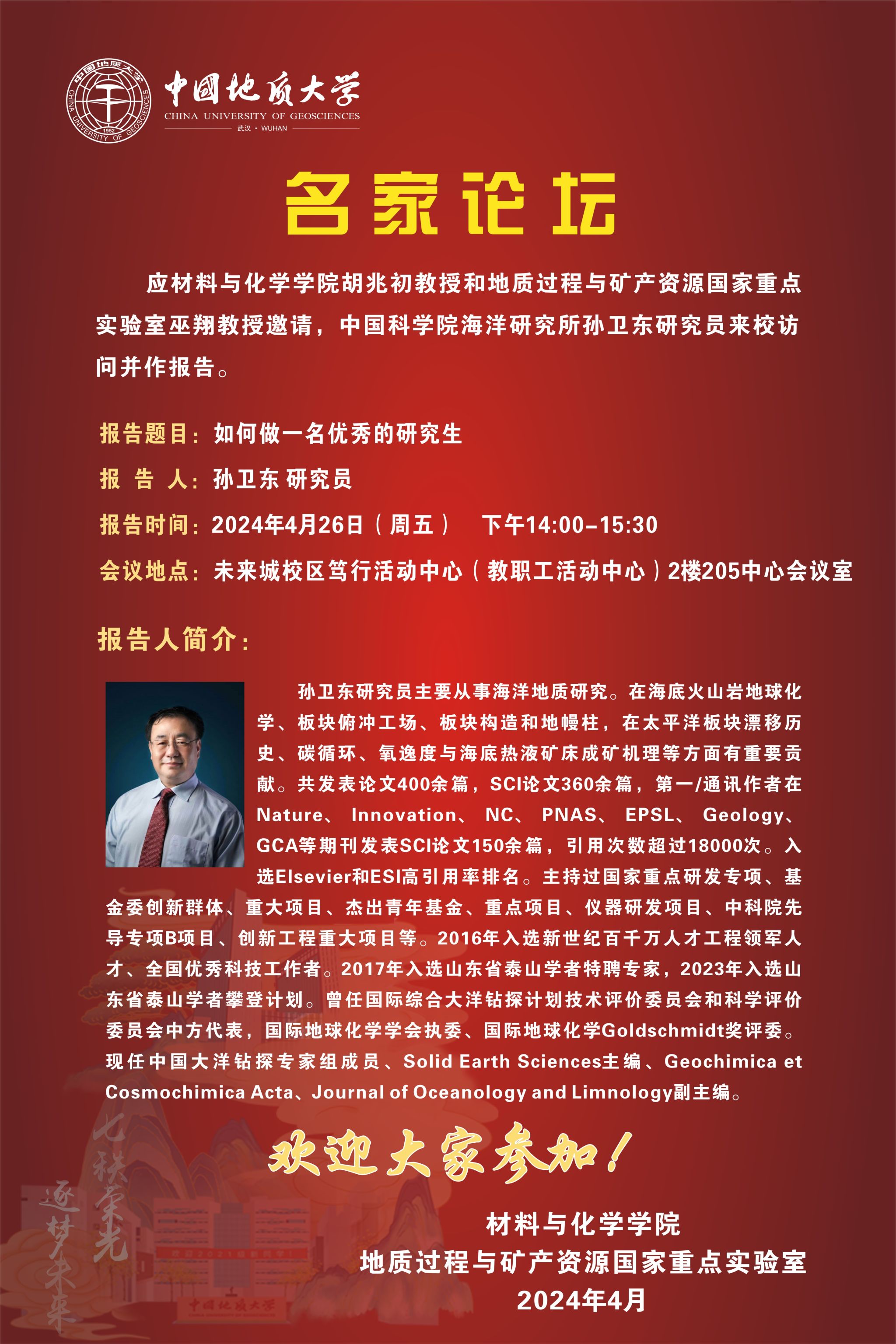 应材料与化学学院及地质过程与矿产资源国家重点实验室邀请,国家自然科学二等奖、安徽省科学技术一等奖获得者,中科院海洋研究所孙卫东研究员将与我院师生交流并讲座。