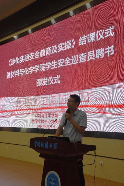 2024年4月26日,在我院《涉化实验安全教育及实操》课程的结课仪式上举行了材料与化学学院学生安全巡查员聘书颁发仪式,学院党委副书记、纪委书记白振洋为我院首批研究生实验室安全巡查员杨培杰、郁东奇、吴仁智和唐观亮颁发了院级安全巡查员聘书,并向他们表示了热烈的祝贺。白书记在仪式上向全体研究生介绍了我院实验室安全的重要性,同时强调了研究生加入我院安全巡查队伍的迫切性,要求全体研究生在日常开展科学研究过程中将课程所学知识学以致用,树立安全意识。