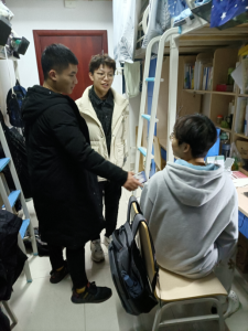 党委书记黄菊和2021级辅导员李双越、2019级辅导员黄玲以及班级主要干部一同走访了学生宿舍,探望慰问返校学生,南望山校区与未来城校区同时进行。走访过程中,学院领导和老师与学生们亲切交流,询问他们开学后的感受,强调疫情防控相关要求,并对学生们在生活中存在的疑虑和问题进行解答。同时黄书记对同学们新学期的学习生活提出相关建议,希望大家在新学期养成良好的生活作息,保持积极向上的学习状态,提醒同学们在学习与生活中遇到任何困难问题都要及时与老师沟通交流,鼓励同学之间要相互理解,相互包容,充实地度过新学期。