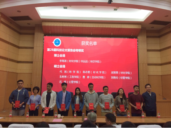2017级博士生李海涛、2015级硕士生胡策策以及2016级硕士生陈志雯在第二十八届研究生科技论文报告会上表现突出,分别在博士会场和硕士会场拔得头筹,荣获“特等奖”,作为研究生代表获得表彰。