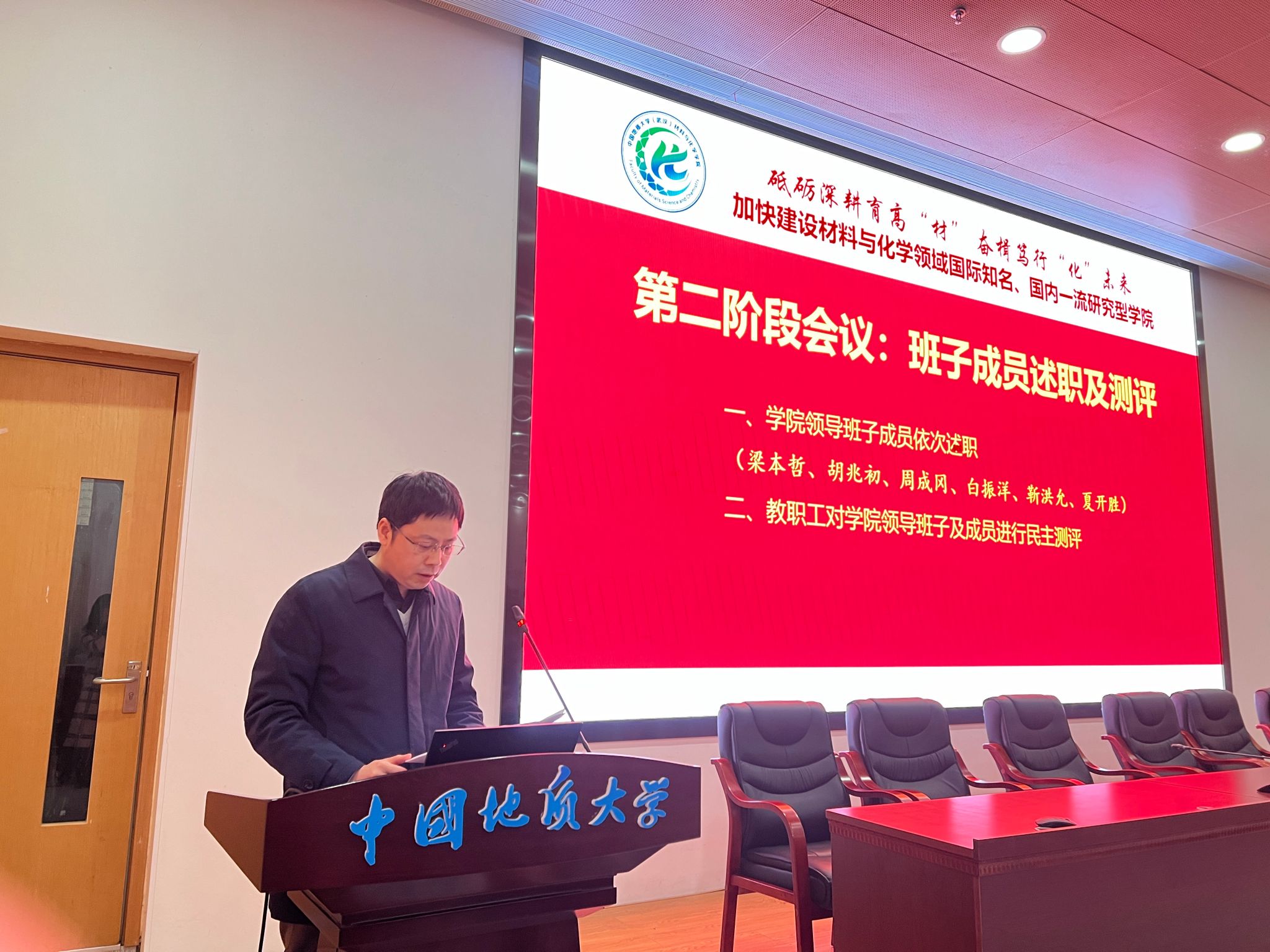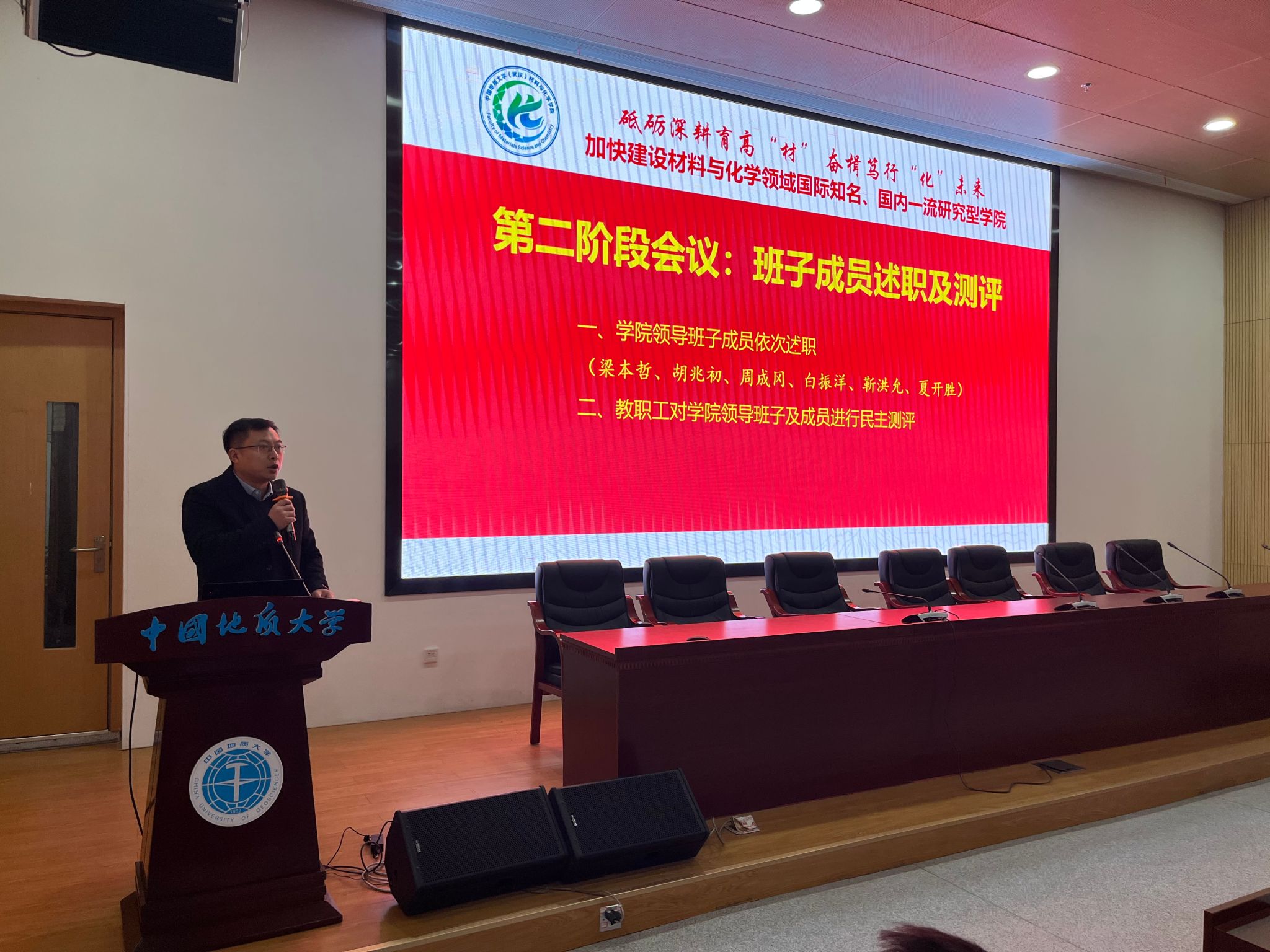 班子成员进行工作述职及民主测评。梁本哲、胡兆初、周成冈、白振洋、靳洪允和夏开胜分别述职。与会人员根据学校统一要求对班子及班子成员进行民主测评。