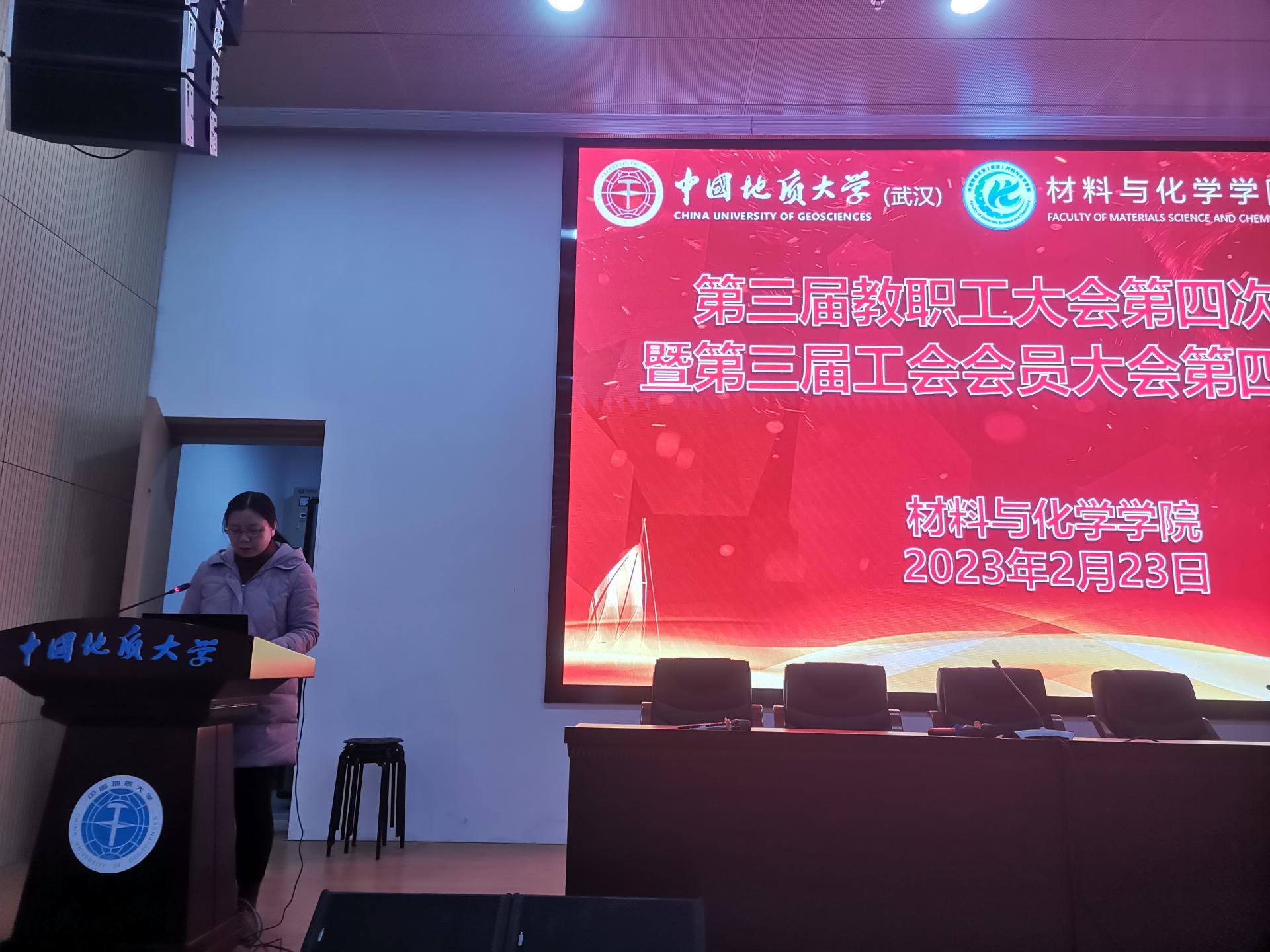 2023年2月23日下午,材化学院第三届教职工大会第四次会议暨第三届工会会员大会第四次会议在未来城校区科教五110会议室隆重召开。大会在雄壮有力的国歌声中开始。材化学院副书记余江涛同志主持会议。