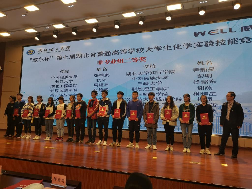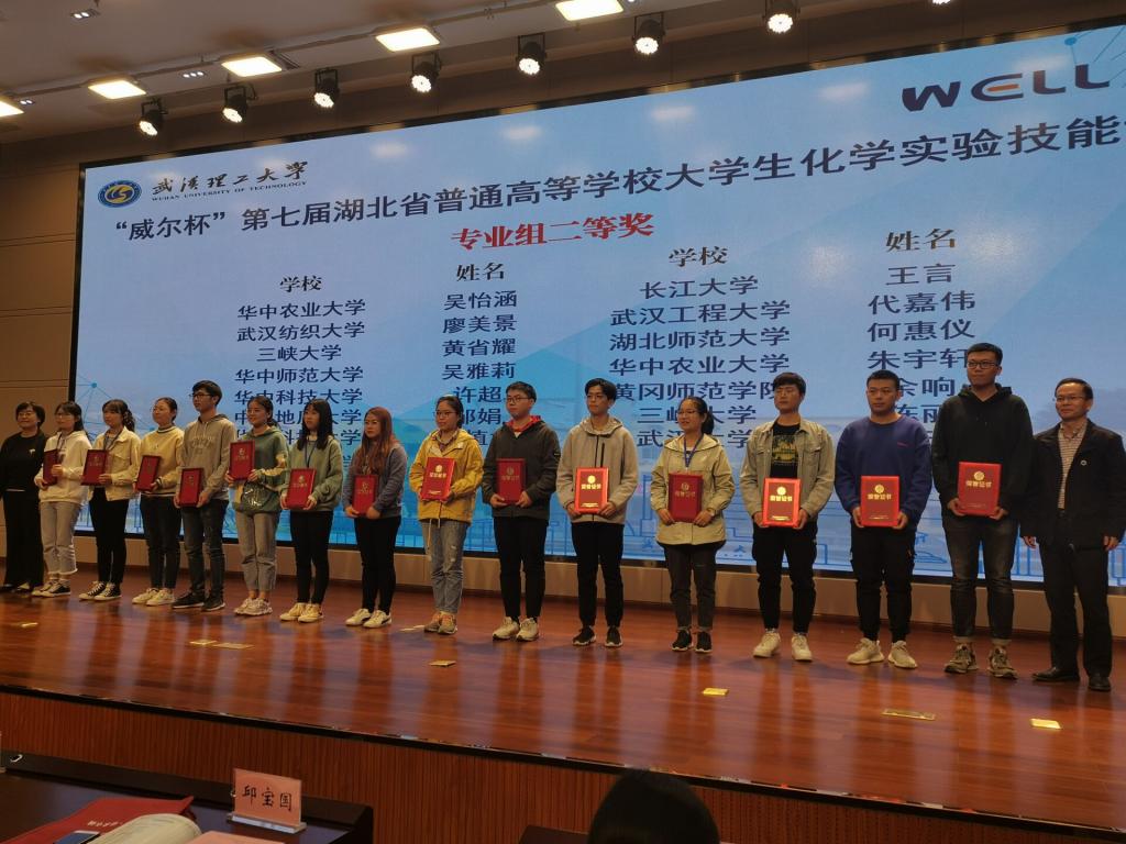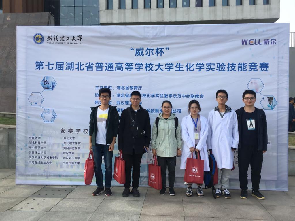 2019年11月8日至10日,第七届湖北省普通高等学校大学生化学实验技能竞赛在武汉理工大学举行。来自湖北省37所高校,近240名化学及近化学专业的本科生、100余名大学化学教师齐聚南湖之滨,参加本次大赛。我校材料与化学学院学子何华威、邹娟、陈烁汀、佘思雨、张益鹏、刘天乐六名同学组建了化学专业队以及非专业队两支队伍,前往武汉理工大学进行为期两天的激烈比赛。经过实验操作与理论考试,何华威、刘天乐分别获专业、非专业队一等奖,邹娟、张益鹏分别获专业、非专业队二等奖。