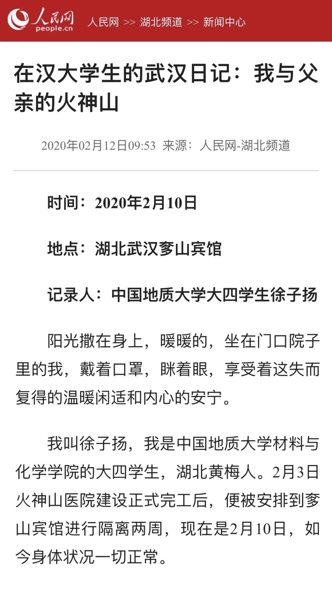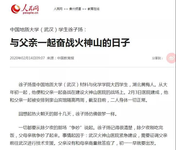 徐子扬,男,1998年5月出生,共青团员,中国地质大学(武汉)材料与化学学院应用化学专业卓越计划班在读本科生。其事迹受到人民网(2月14日)、光明网(2月17日)、中国青年报(2月18日)、中国教育报(2月14日)、中国青年网(2月13日)、湖北日报(2月12日)等媒体广泛报道。