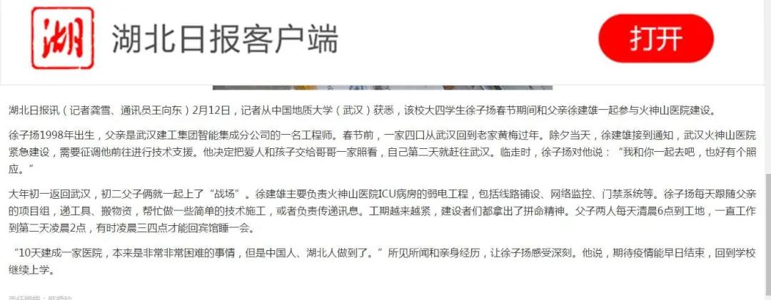 除夕夜,徐子扬一家刚刚吃过年夜饭,父亲告诉一家人,武汉火神山医院紧急建设,公司征调他进行技术支援,明天一早就出发。听说父亲要去武汉,徐子扬内心非常纠结:母亲乳腺癌晚期正在化疗,3岁的妹妹也需要人照顾,父亲是家里的顶梁柱,万一去武汉感染上病毒,后果不堪设想。可是国事前无家事,最终徐子扬决定让妈妈和妹妹先去大伯家,自己随同父亲一起前往武汉支援火神山医院建设,彼此之间也好有个照应。第二天早上8点,父子二人从黄冈市黄梅县的家里出发奔赴火神山施工现场。