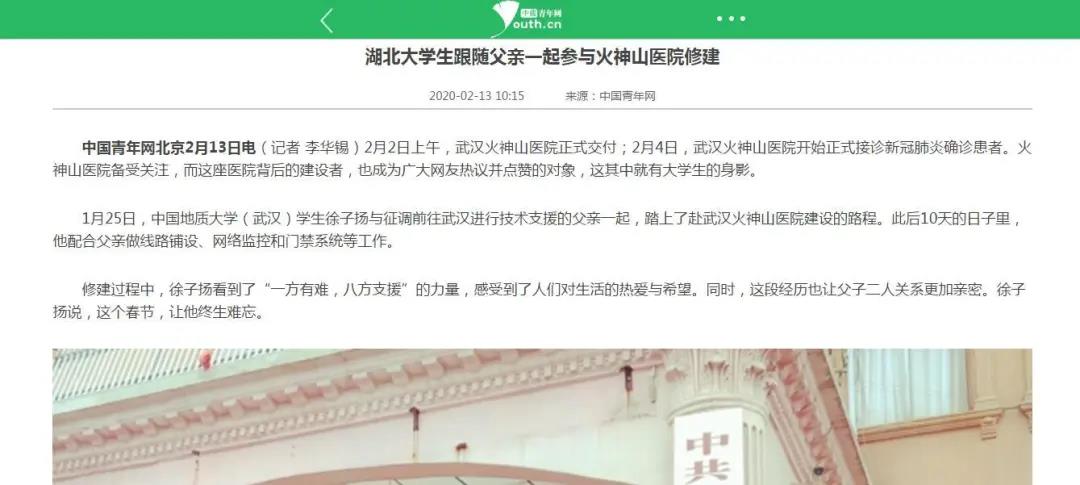 徐子扬同学于2020年1月25日奔赴武汉,连续10天全程参与火神山医院建设。前后共历时29天,他完成了一名普通学生向有为青年的转变,谱写了当代青年与祖国同呼吸、共命运的青春之歌。