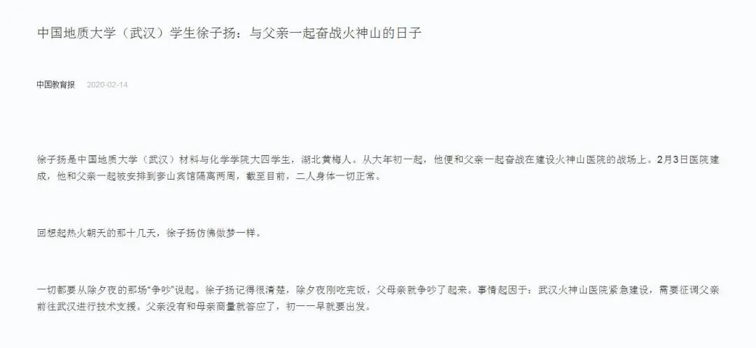 2020年春节期间,新冠病毒引发的肺炎疫情爆发,武汉的天空阴霾密布。在全网直播的火神山医院建设现场,几千万人的同时注视下,一名来自中国地质大学的学生,穿着工作服、戴着安全帽和口罩,与父亲一起参与医院建设工作。他就是徐子扬。