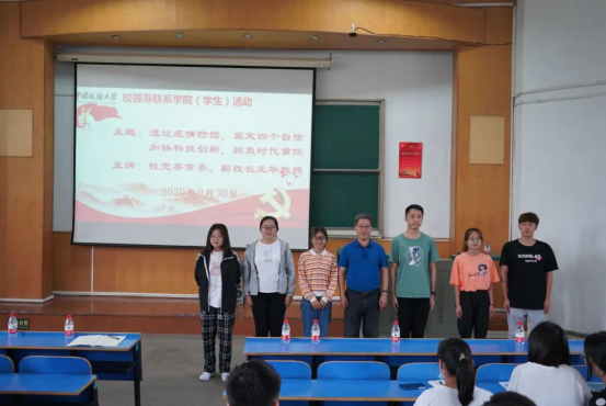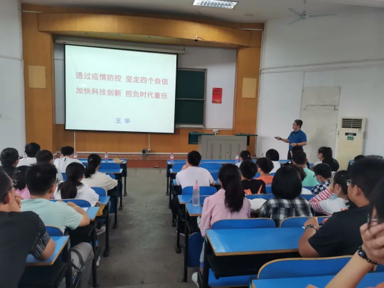 9月30日上午,校党委常委、副校长王华教授为材料与化学学院师生作题为“透过疫情防控,坚定四个自信;加快科技创新,担负时代重任”的专题辅导报告。学院党委副书记余江涛主持讲座活动,包括全体2020级本科生在内的300名师生聆听了报告会。
