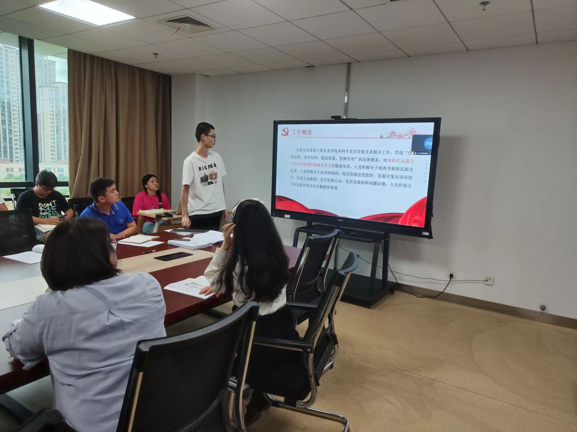 1202201党支部书记程瑶结合支部建立长效学习机制、落实责任机制、加强党员之间交流等做法分享了所在支部在党员的教育、管理、监督、凝聚等方面工作经验。1202102党支部书记宋京阳围绕如何发展合格党员分享了所在支部依托主题党日团结凝聚非党员同学特别是入党积极分子、强化思想引领以及扎实做好入党材料的审核把关等方面的做法与经验。