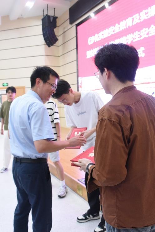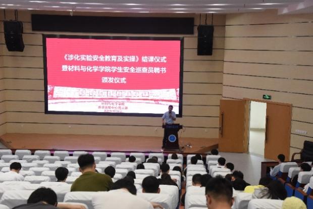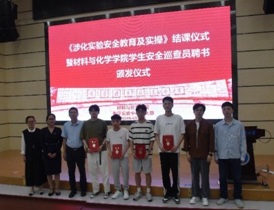 2024年4月26日,在我院《涉化实验安全教育及实操》课程的结课仪式上举行了材料与化学学院学生安全巡查员聘书颁发仪式,学院党委副书记、纪委书记白振洋为我院首批研究生实验室安全巡查员杨培杰、郁东奇、吴仁智和唐观亮颁发了院级安全巡查员聘书,并向他们表示了热烈的祝贺。白书记在仪式上向全体研究生介绍了我院实验室安全的重要性,同时强调了研究生加入我院安全巡查队伍的迫切性,要求全体研究生在日常开展科学研究过程中将课程所学知识学以致用,树立安全意识。